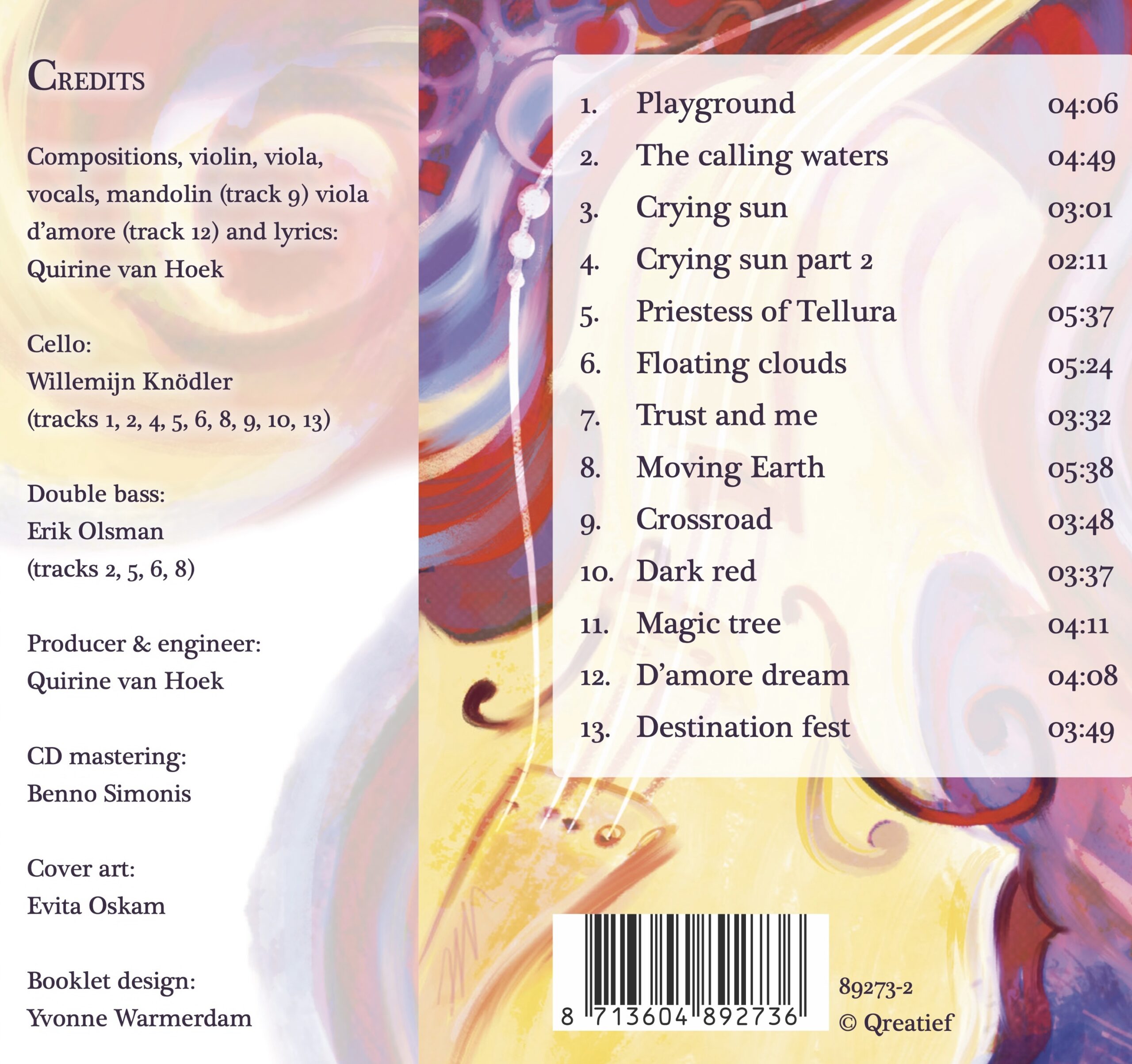 Het grappige is dat ik in het begin dacht dat ik alle toeters en bellen die ik kon vinden in huis (trommels, slagwerk, fluitjes) nodig zou gaan hebben, maar uiteindelijk heb ik alleen maar mijn ‘normale’ instrumenten (viool, altviool, viola d’amore, mandoline en mijn stem) gebruikt. Wat dat betreft zou je kunnen zeggen dat ik toch even op veilig en bekend terrein ben gebleven. Wie weet ga ik in een volgend album wat meer experimenteren.